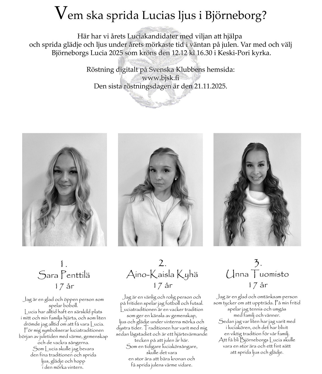 Jag är en glad och omtänksam person som tycker om att uppträda. På min fritid spelar jag tennis och umgås med familj och vänner. Sedan jag var liten har jag varit med i luciakören, och det har blivit en viktig tradition för vår familj. Att få bli Björneborgs Lucia skulle vara en stor ära och ett fint sätt att sprida ljus och glädje.